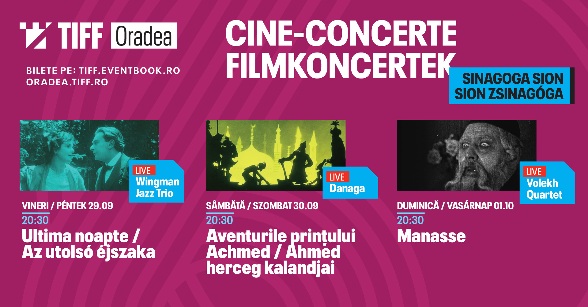 Cine-concert Aventurile prințului Achmed (r. Lotte Reiniger). Primul lungmetraj de animație din istoria cinematografică. Filmul mut are o frumusețe și un rafinament grafic aparte, siluetele personajelor fiind inspirate din universul de basm al celor O mie și una de nopți. La TIFF Oradea, animația, împreună cu coloana sonoră interpretată la sintetizator analog și baglama de artistul Danaga, vor transpune spectatorii într-un univers de poveste. În ultima seară de festival, publicul este invitat la Manasse (r. Jean Mihail), în care lupta dintre tradiție și modernitate pe ritmuri klezmer și lăutărești, într-un clasic al filmului mut românesc.. FIlmul va fi acompaniat de Cvartetul Volekh, un ansamblu acustic klezmer din București, ce explorează conexiunile dintre repertoriile tradiționale de muzică idiș și românească din Valahia și Moldova.