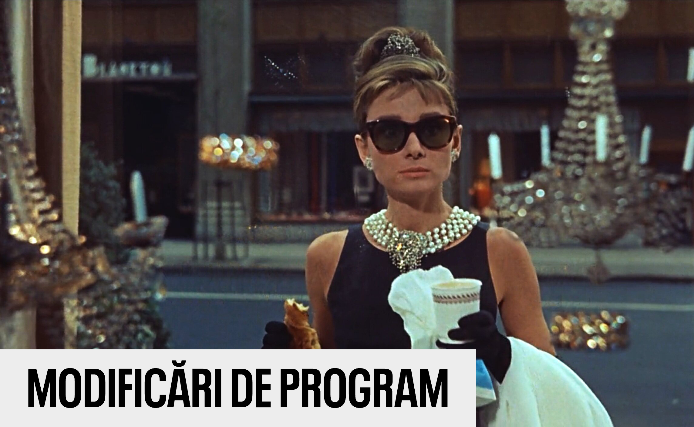 Din cauza temperaturilor scăzute și a vântului puternic, proiecția filmului Mic Dejun la Tiffany din această seară de la ora 20:00 din Piața Unirii se anulează. Vă așteptăm la celelalte proiecții din interior: