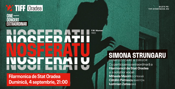 La aniversarea a 100 de ani de la premiera filmului, orădenii au ocazia să urmărească versiunea originală a filmului Nosferatu, acompaniată în premieră absolută de artiștii Filarmonicii - duminică, 4 septembrie, de la ora 21:00. Spectacolul muzical va fi completat de interpretările sopranei Mihaela Maxim, alături de Cătălin Petrescu (bariton) și Iustinian Zetea (bas), sub bagheta dirijoarei Simona Strungaru, cea care semnează și muzica originală care va însoți proiecția.