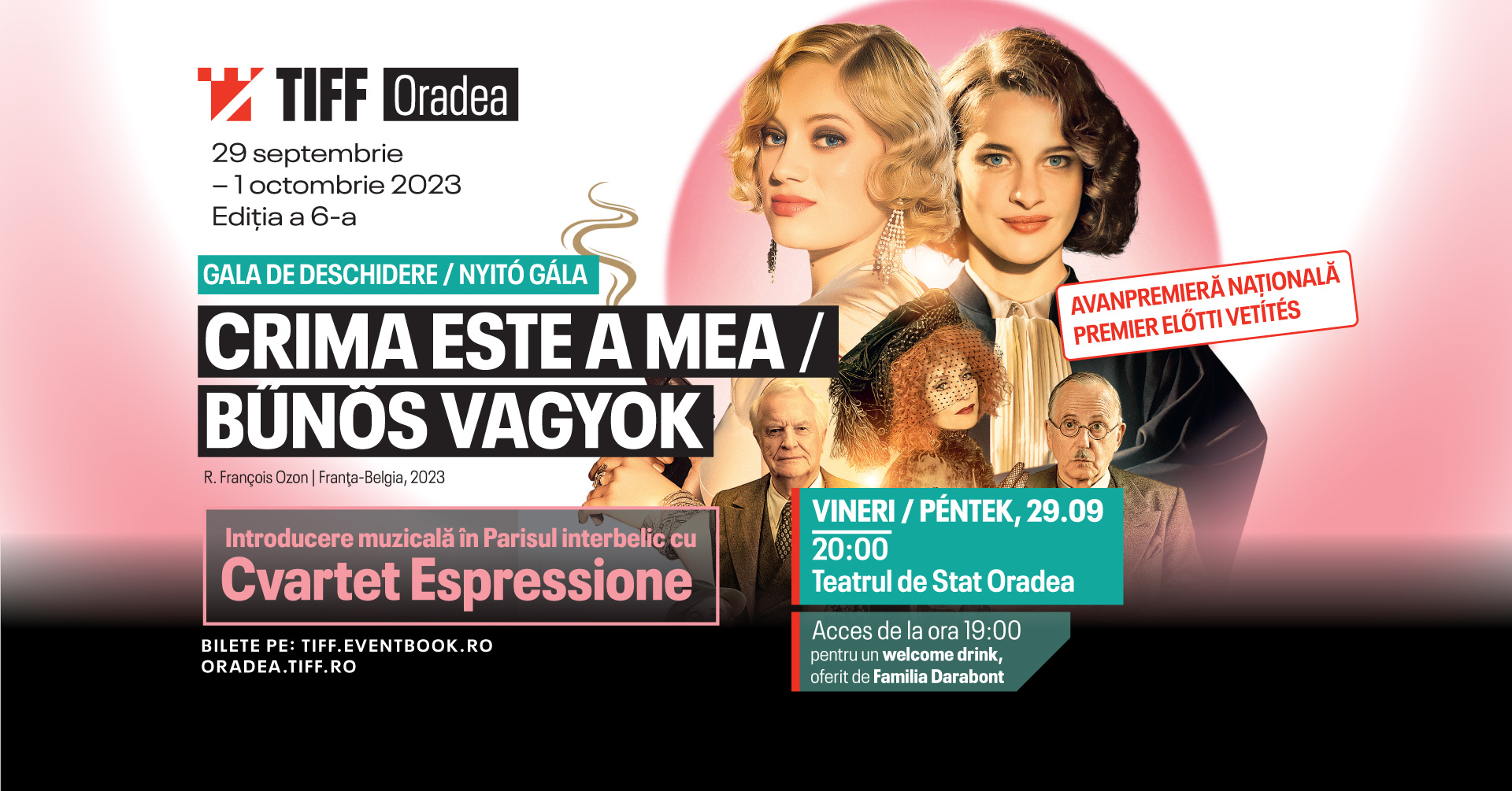 Vineri, 29 septembrie, TIFF Oradea deschide oficial ușile la Teatrul de Stat cu proiecția în avanpremieră națională a filmului Crima este a mea/ Mon Crime (r. François Ozon). Spectatorii prezenți la Gala de Deschidere vor fi întâmpinați pe muzica celor de la Espressione, care, inspirați de atmosfera filmului din deschidere, vor face o introducere muzicală în Parisul Interbelic. Cvartetul Espressione a fost înființat în anul 2014 de patru tinere instrumentiste: Costin Éva – vioara I, Szabó Éva – vioara a II-a, Anca Cristea – violă, Ichim Beáta – violoncel și abordează genuri muzicale variate: muzică clasică, café-concert, muzică de film și jazz.